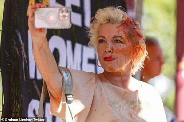 On the day of the rally, Kellie-Jay was ‘attacked’ on her way to the stage and another trans ‘activist’ by the name of Eliana Rubashkyn poured tomato soup on her .