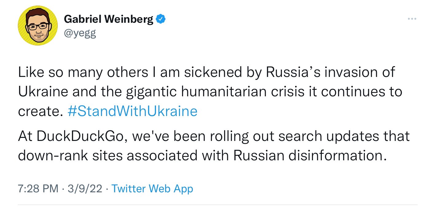 Here is a Tweet their Founder and CEO put out in March 2022 as the Russia/Ukraine conflict started: