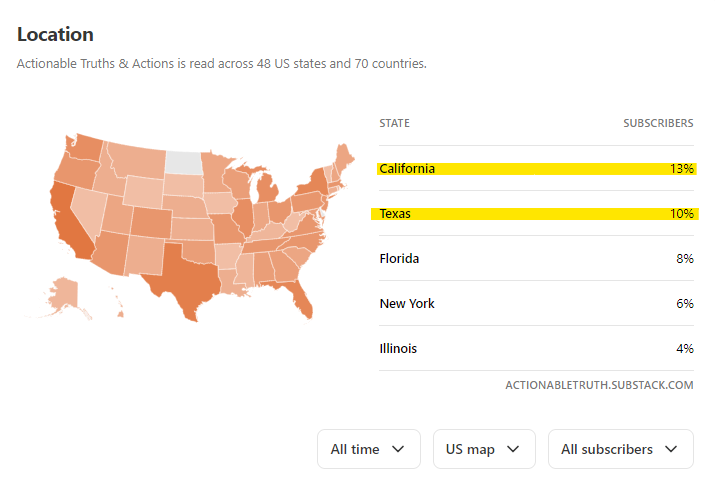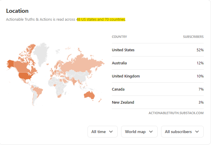 As you can see, if you are getting this via email or your Inbox on Substack, you are more likely to be from the US than anywhere else.