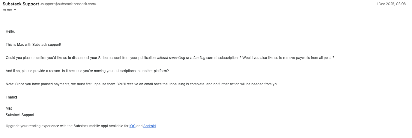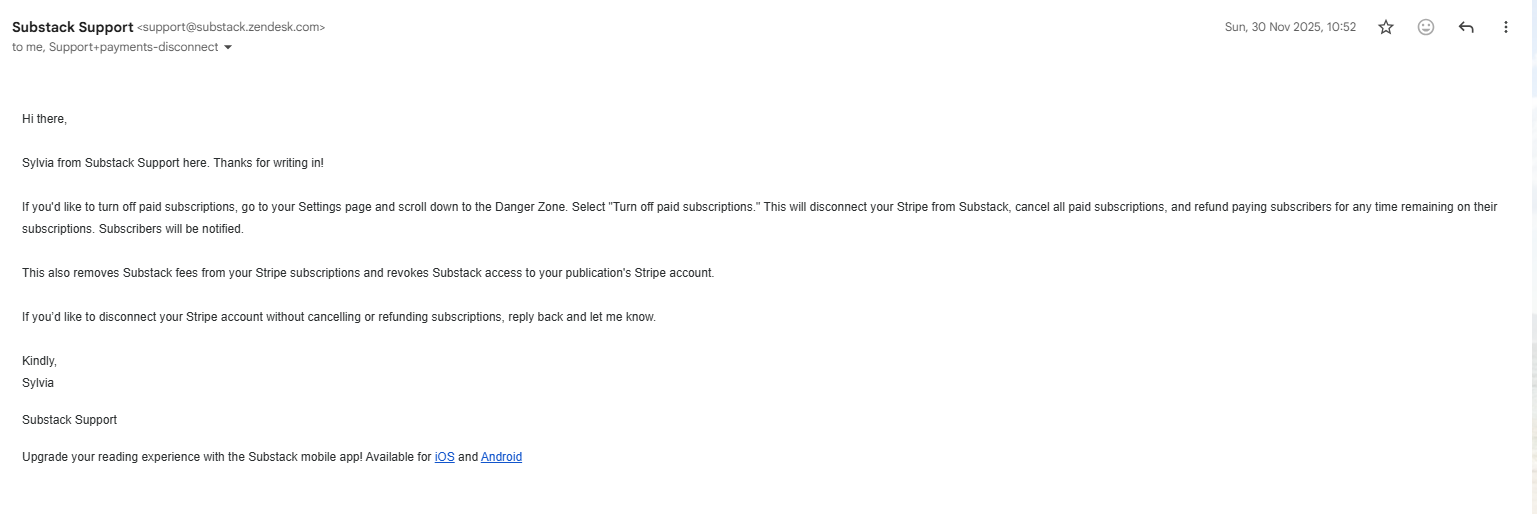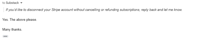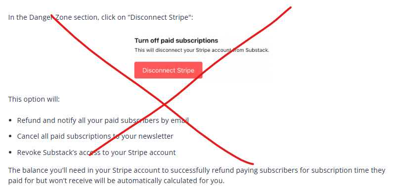 If you currently have paid subscribers on your Substack and even if those paid subscriptions are currently paused, resist the urge of just going into your publication dashboard and disconnecting the Stripe account yourself.