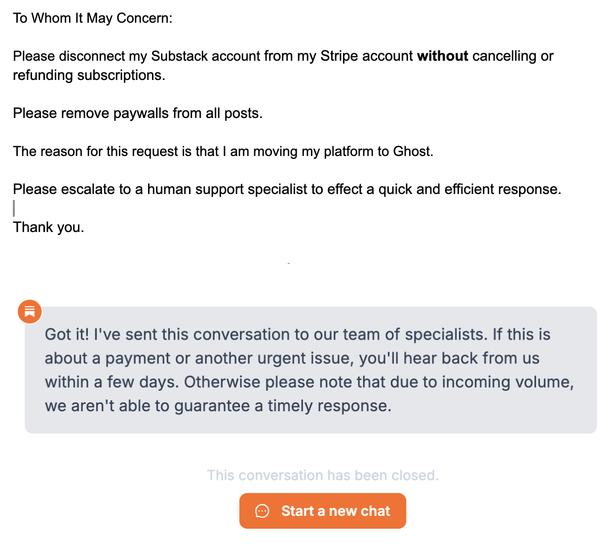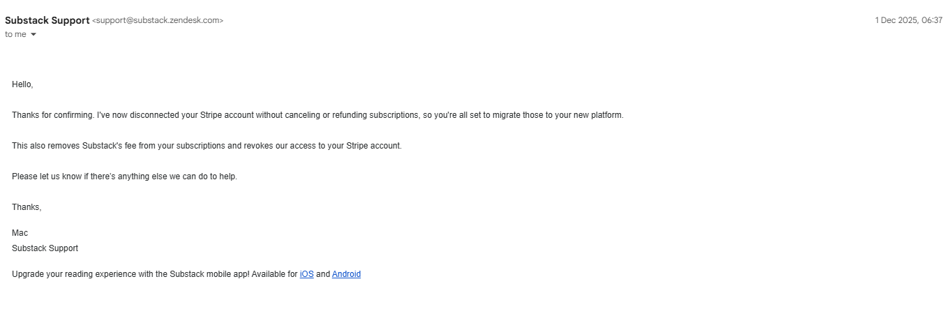 If you've already sorted out your paid subscriptions on another platform and are ready to cut off Substack, it is imperative that Substack sever the connection on their end rather than you doing it yourself through the Substack publisher dashboard.