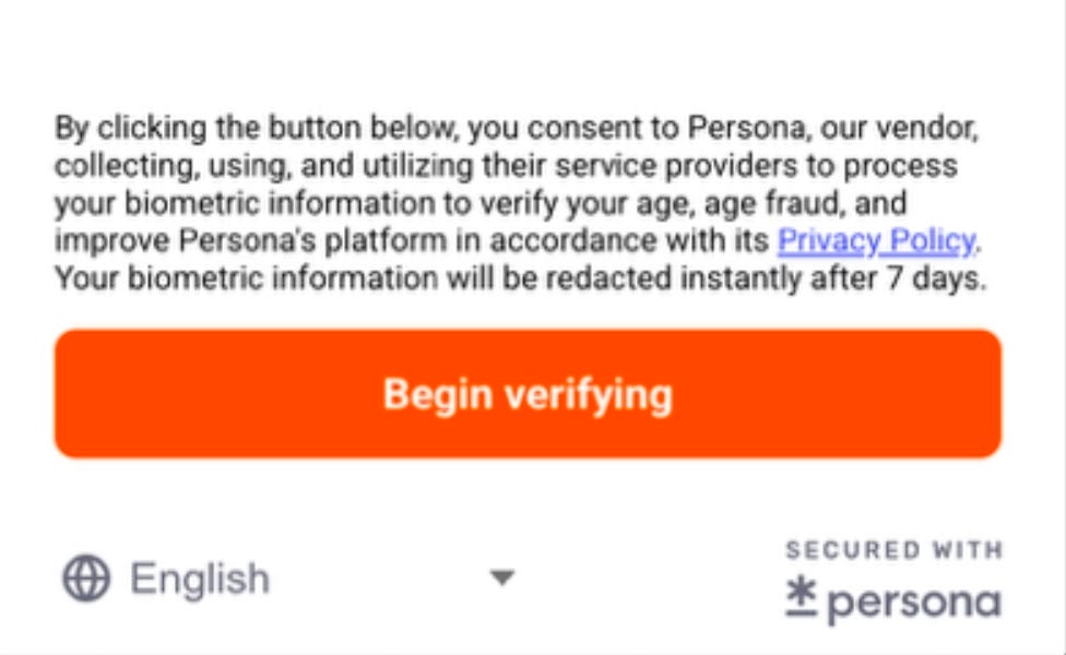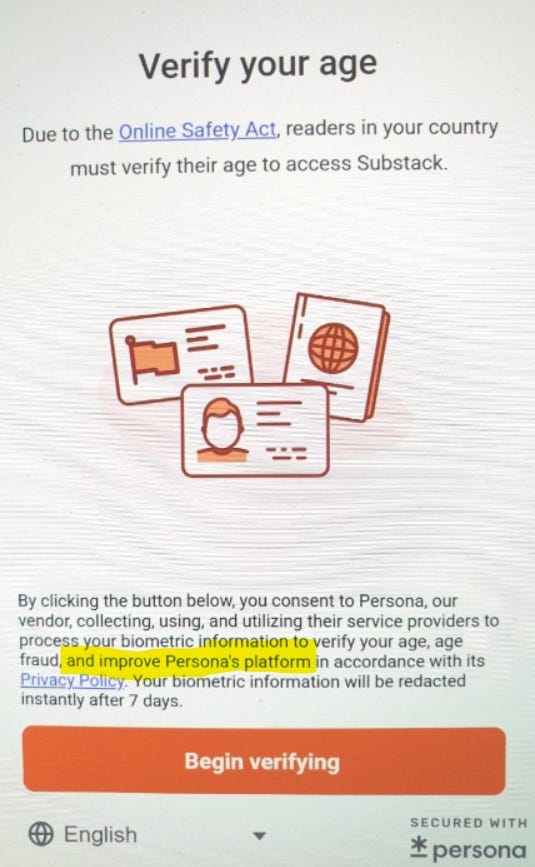 As you can see from the clip above, I already knew at that point that Substack contracted a company called Persona to conduct "age verification" for them in preparation for complying with the incoming legislation both in Australia and the UK.