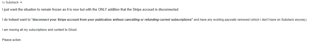 - If you've already decided on where you will move your paid subscriptions to and have everything you need to set up elsewhere, you can ask Substack to sever their connection to your Stripe account from their end as explained further down. If like me, you are moving to Ghost, make sure you complete the following workflow in your Ghost backend FIRST after connecting the same Stripe account you've used for Substack.