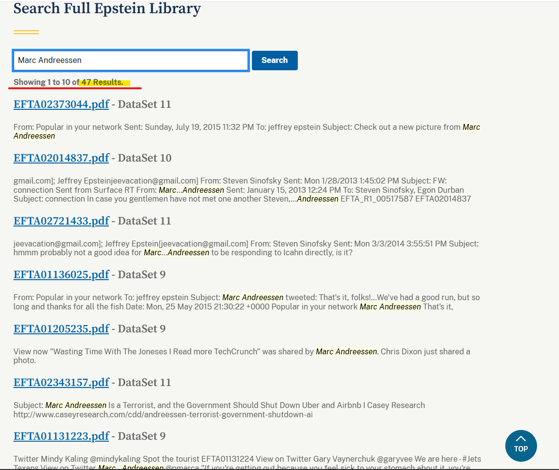 The name Marc Andreessen can be found 47 times in the DoJ dump with all the mentions being across three datasets: 9, 10 and 11: