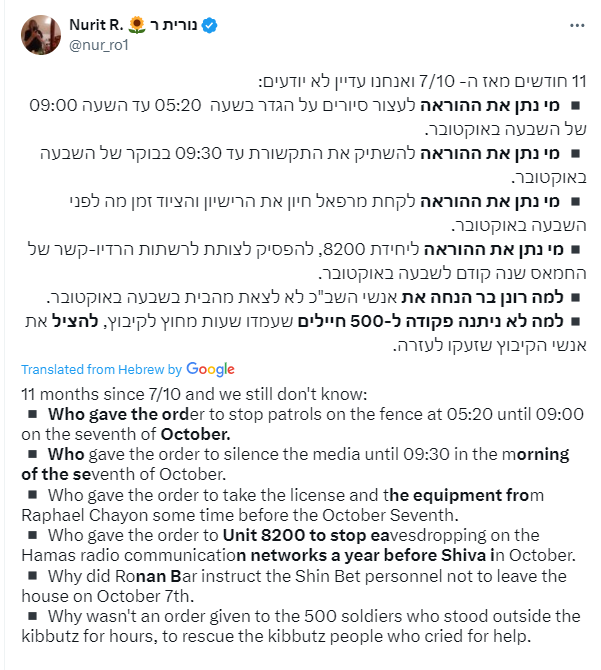 Here is a testimony of Golani combat soldier Shalom Shitrit, who was critically injurred that morning at the Paga outpost, of the (very bizarre) orders they received: - 5:00am - The IDF Chief of staff Halevi conducts a Teleconference with the head of Shin Bet Ronen Bar, Commander of the Southern Command Finkelman and other top brass. They apparently try to patch in the Head of Military Intelligence Haliva but he doesn’t answer his phone. Again, this is very strange as Halevi is Haliva’s commanding officer. How do you not answer the phone when your commanding officer is calling you?
