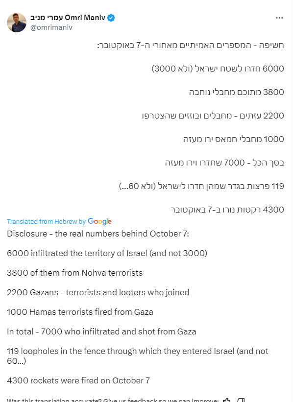 As an ‘appetizer’ for this section, it is worth mentioning that none other than the military correspondent of Israel’s public broadcaster Kan reported as early as November 6 last year (in Hebrew) that some of the terrorists who took part in the October 7 attacks were NOT from Gaza. Furthermore, some may have been FOREIGN NATIONALS altogether.