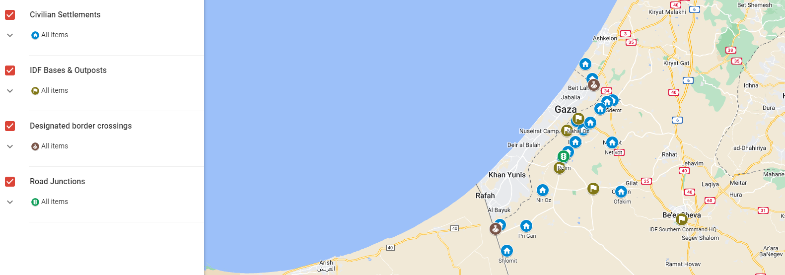 I’ve created a map featuring most of the IDF bases and outposts, the two official border checkpoints between Israel and the Gaza strip and most importantly, the Israeli civilian settlements where key events happened on October 7 last year: