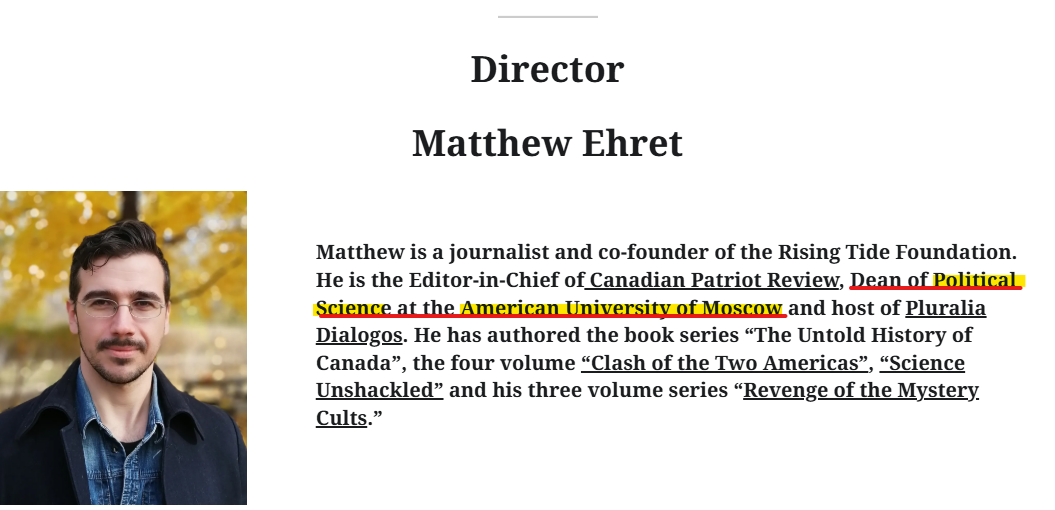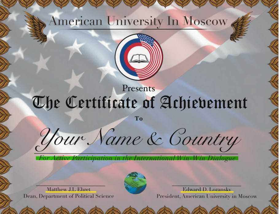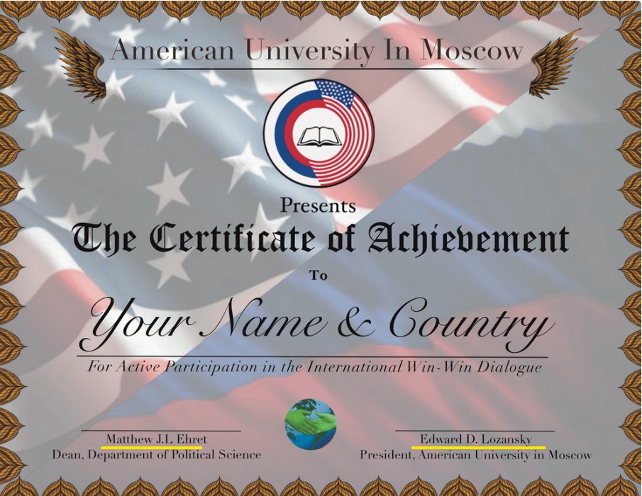 Despite that, the certificate above featuring Edward D. Lozansky as "President" and Matthew J.L Ehret as "Dean of the department of Political Science" still use the name "American University in Moscow".