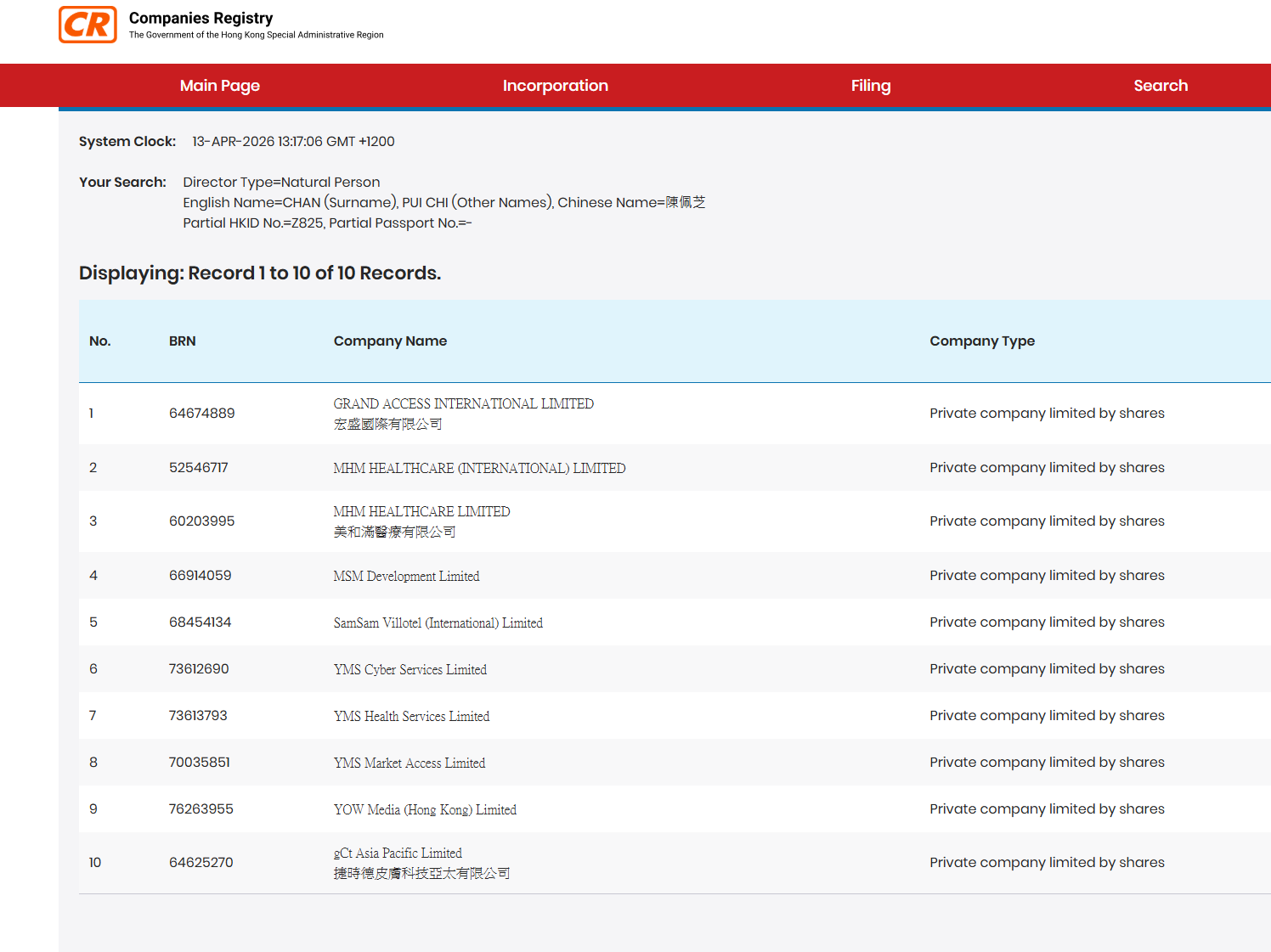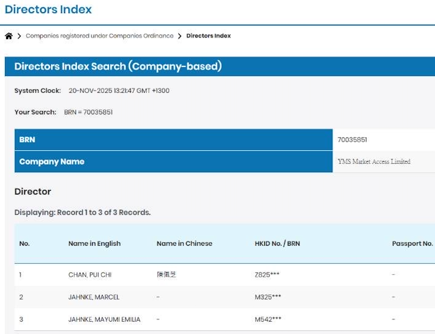 YMS Market Access is registered in Hong Kong as the screenshot from the Hong Kong Companies Registry shows: