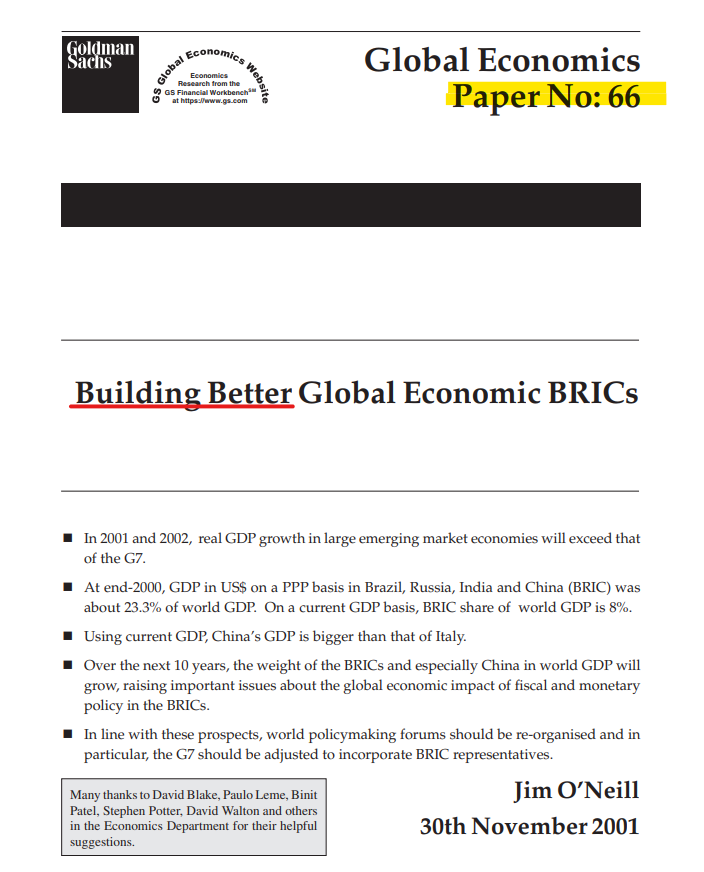 What is interesting to note is that the idea behind BRICS was very much a western idea with the concept first being introduced in a 2001 paper called "Building Better Global Economic BRICs" written by Jim O'Neill, who was at the time the head of global economics research at Goldman Sachs and later became the Chairman of Goldman Sachs Asset Management.