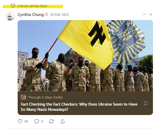 This is the article Mr. Jahnke liked and as you can see, it was written by fellow RTF Director (and President), Christine Cynthia Corey under her 'pen name' (??) Cynthia Chung shortly after Russia started its "special military operation" in Ukraine.