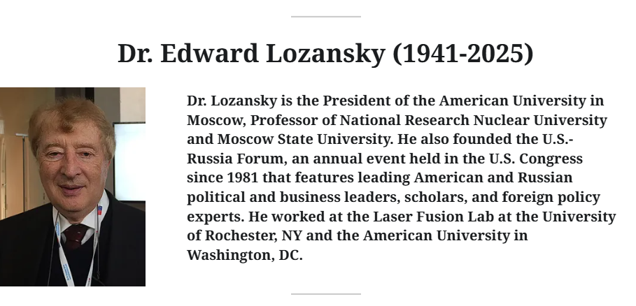 Dr. Edward Lozansky has passed away last year so I acknowledge that he can therefore no longer respond to any questions about himself or his work history.