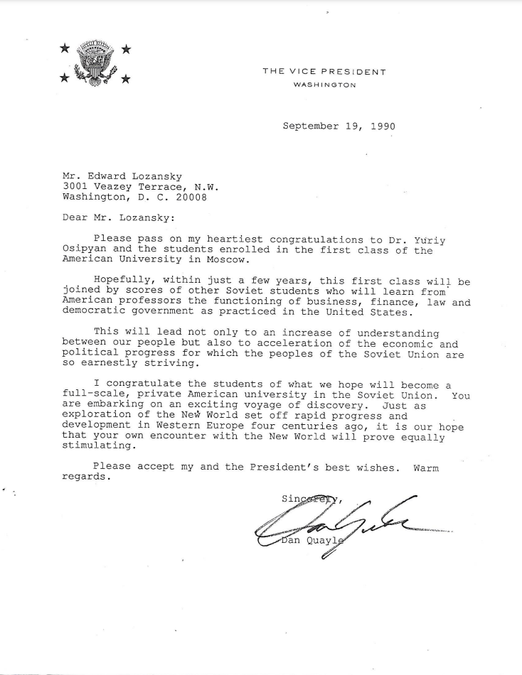 The same page also displays a 1990 letter from 1990 the Vice President of the United States at the time Dan Quayle, which is addressed to Dr. Lozansky directly and congratulaing him on the commencement of the first class of the "American University in Moscow":