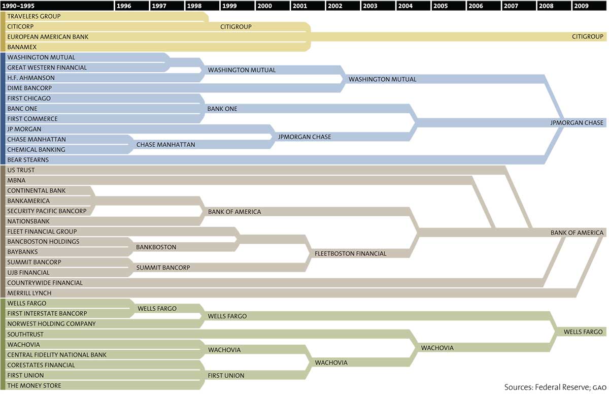 As an example, take a look at the diagram below which outlines in very stark terms how 37 American banks became just four (an 89% reduction!!) in the space of less than 20 years with most of the consolidation happening in just 13 short years!