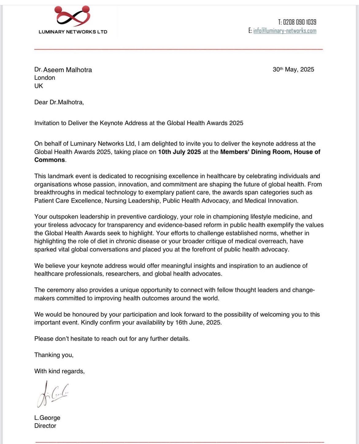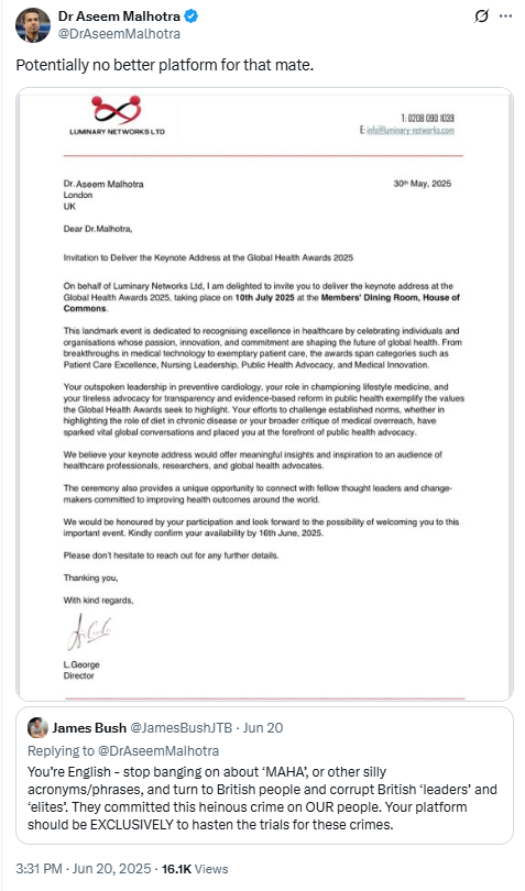 He is also obviously a director at Luminary Networks who are the organisers of the Health Awards Malhotra was invited to deliver a keynote to.