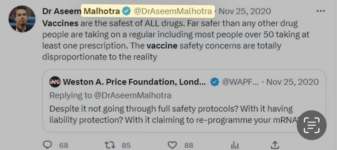 We are providing this background because it is important to understand the context of Dr Aseem Malhotra’s claimed ‘awakening’ which resulted from his (esteemed) father’s sudden cardiac arrest and subsequent passing.