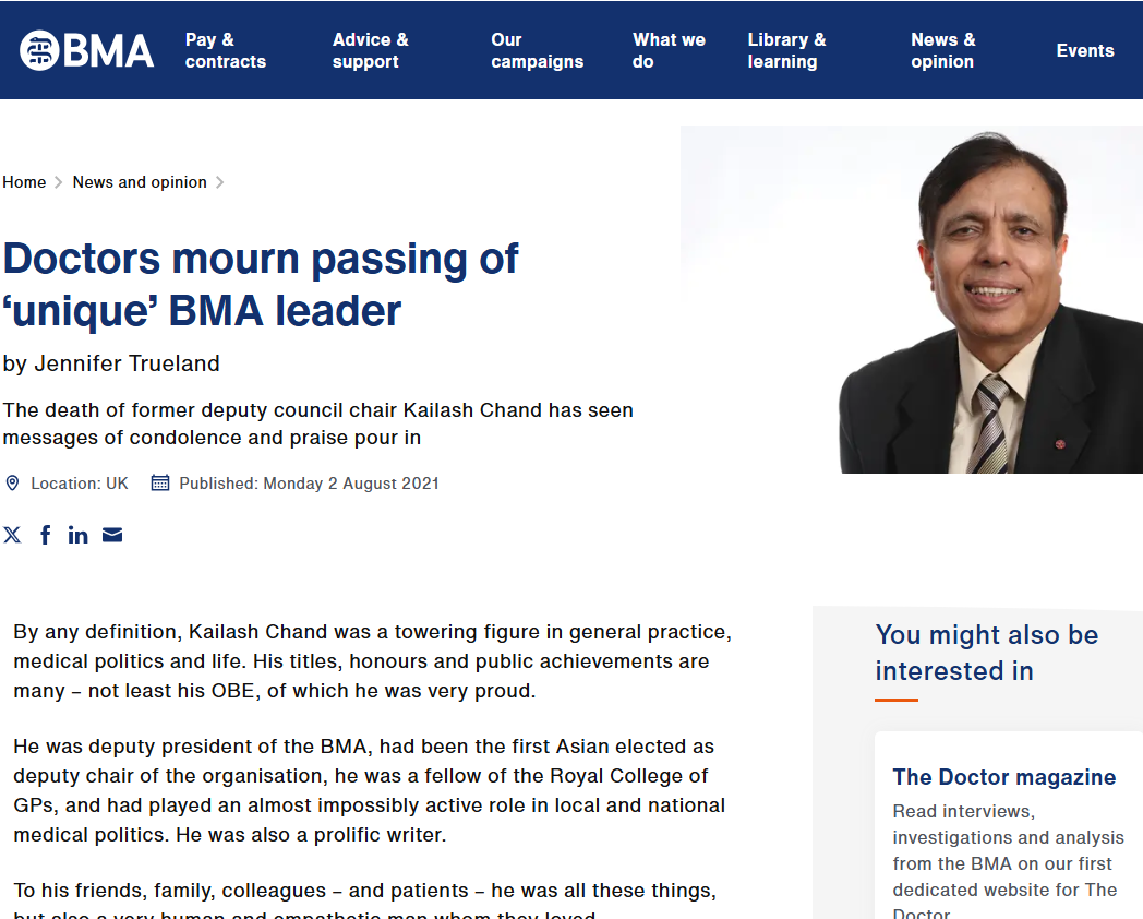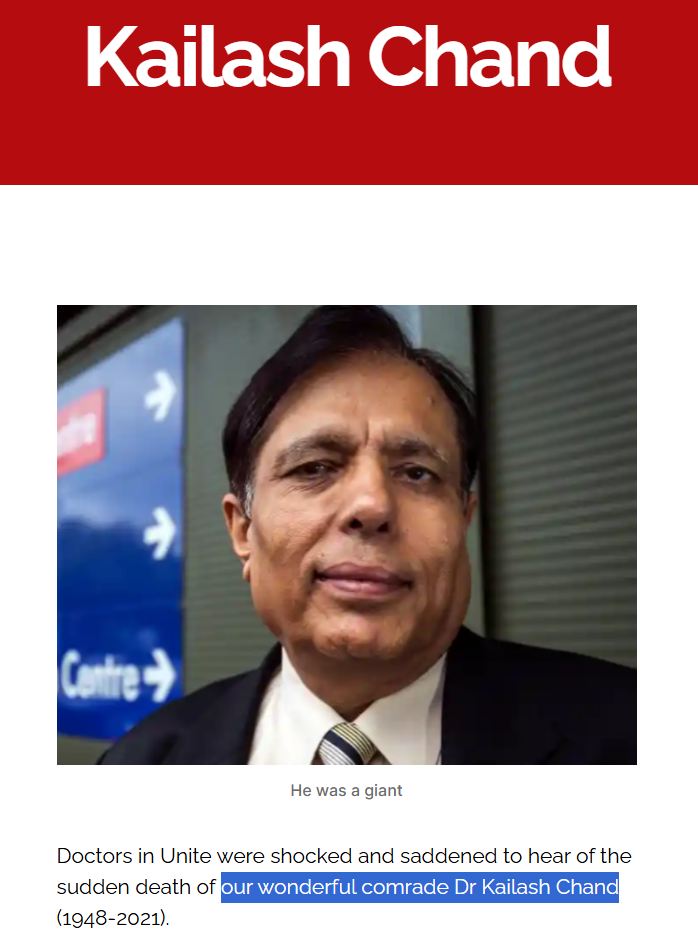 Another obituary was published by Doctors in Unite on their website in which Dr Kailash Chand was referred to as: