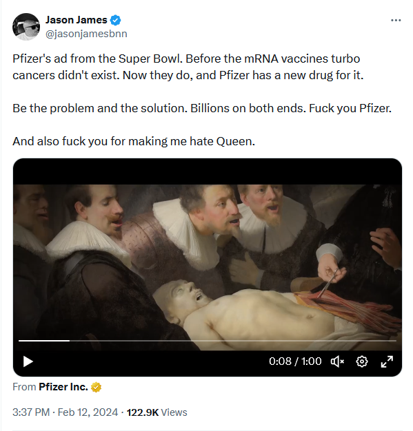 Pfizer's ad from the Super Bowl. Before the mRNA vaccines turbo cancers didn't exist. Now they do, and Pfizer has a new drug for it.