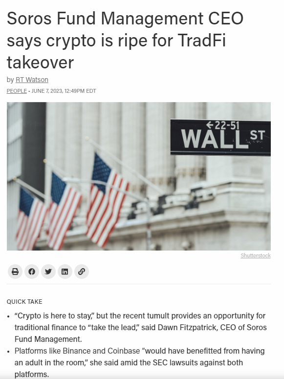 This is no different. If Soros henchwoman Dawn Fitzpatrick thinks that the crypto industry is “ripe” to be taken over by the big banks and capital venture funds like hers (which is what “TradFi” or Traditional Finance means), she almost certainly has access to some information you don’t and most importantly: if this does indeed happen, it will be very very bad for you and me!