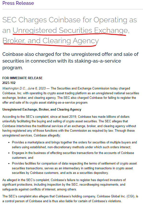 A mere day later, the SEC issued another press release with this one discussing legal action they are taking against Coinbase, the single biggest Cryptocurrency exchange in the US and also an American Public company listed on the NASDAQ.