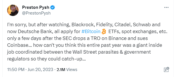 As an example, the very same CEO of BlackRock who is in the process of launching a Bitcoin ETF as discussed above, referred to Bitcoin as an “index of money laundering” as recently as 2017. Guess he decided to do some “money laundering” of his own…