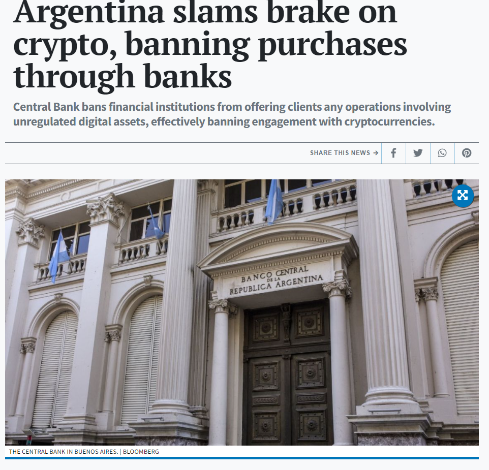 Meanwhile in Argentina, the government and the central bank there have moved way past warning and have introduced formal and strictly enforced bans on Argentinians using their own money to purchase cryptocurrencies.