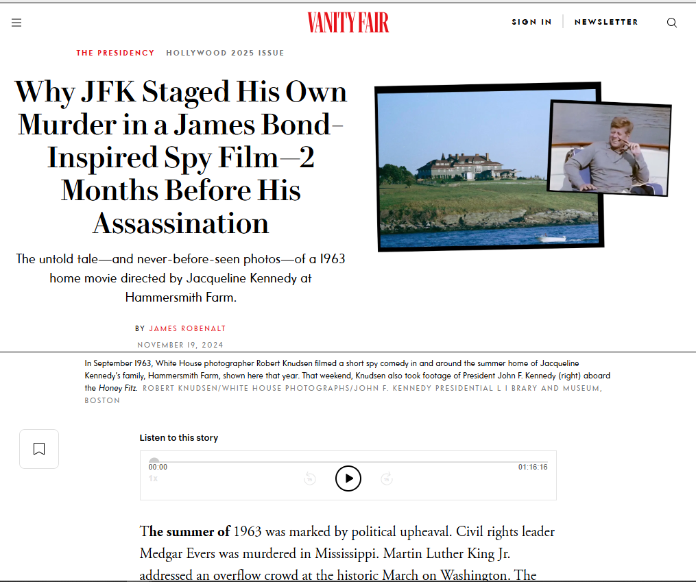 To add further to the above proposed theory of what has actually happened on November 22, 1963, the following was published recently by Variety magazine (click the image below to read an archived version which also bypasses all ads and pop-ups):