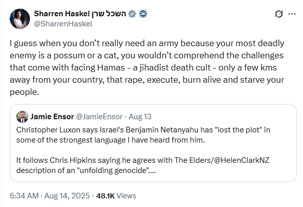 His Foreign Minister, Deputy PM and senior coalition partner Winston Peters, said that New Zealand is considering to formally recognise a Palestinian State and will make a final decision next month (September, so same as the UK):