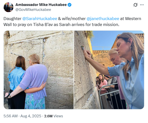 In case you didn’t know, the current US Ambassador to Israel Huckabee is also the father of current Arkansas Governor (and formerly Trump’s Press Secretary during his term as POTUS 45) Sarah Huckabee Sanders.