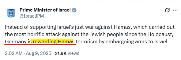 Israel’s narrative for quite some time now has been that ANY concession towards the Palestinians, which is not conditional on Hamas disarming and releasing all the remaining Israeli hostages FIRST, is “rewarding Hamas”. This talking point was embraced enthusiastically by the current US Administration including the President, his Secretary of State and his Secretary of Defence.
