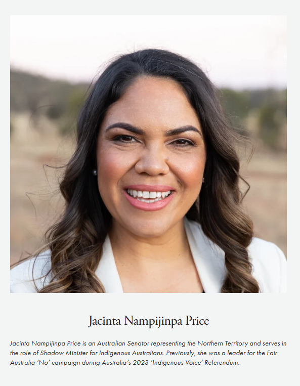 Price’s rise to fame came during last year’s “Indigenous Voice to Parliament” referendum where she played a leading role in the (overwhelmingly victorious) “NO” camp, together with Warren Mundine, who is also affiliated closely with ARC.