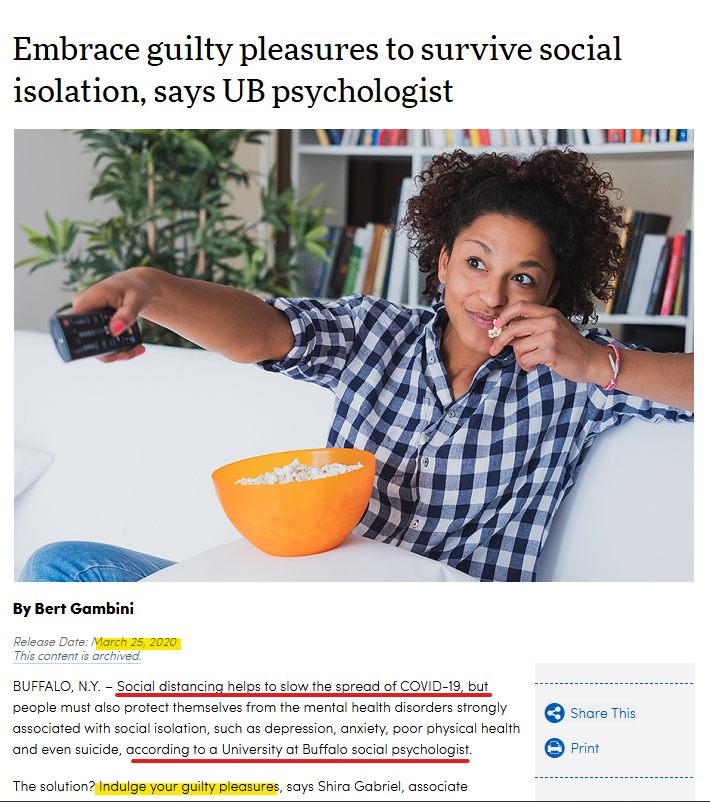 Right, so Prof. Gabriel encouraged everyone to “indulge your guilty pleasures” during the early days of lockdown (because “social distancing helps slow the spread” etc etc).