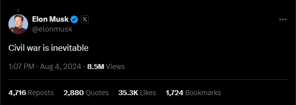 The “free speech absolutist” also chimed in with a statement that doesn’t really help with calming things down or even lifting spirits…