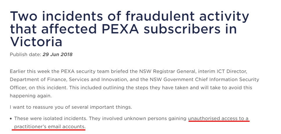 In case you don’t come from an information security background, unauthorised access to an email account can easily result in the attacker being able to access any system said email address has a login for (provided there is no two-factor-authentication in place which there wasn’t for PEXA at the time of that incident) by resetting the password.