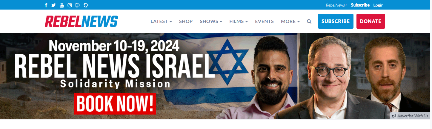 “The Rebel Media” is also known as Rebel News and its website has the following banner at the very top of its homepage at the time of publication: