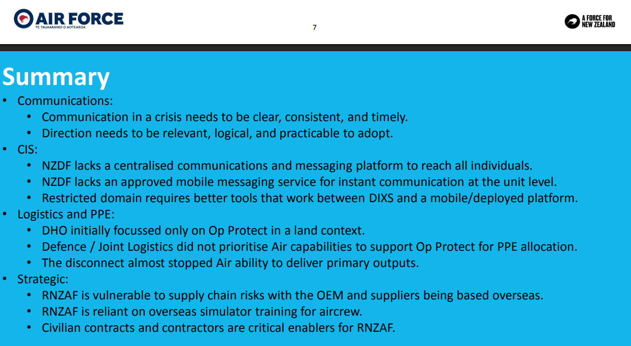 One Conference Panel noted some serious failures, Group Captain Shaun Sexton, base commander for RNZAF (and others) pointed at the lack of any NZDF approved mobile messaging service, preventing effective communication during lockdowns: