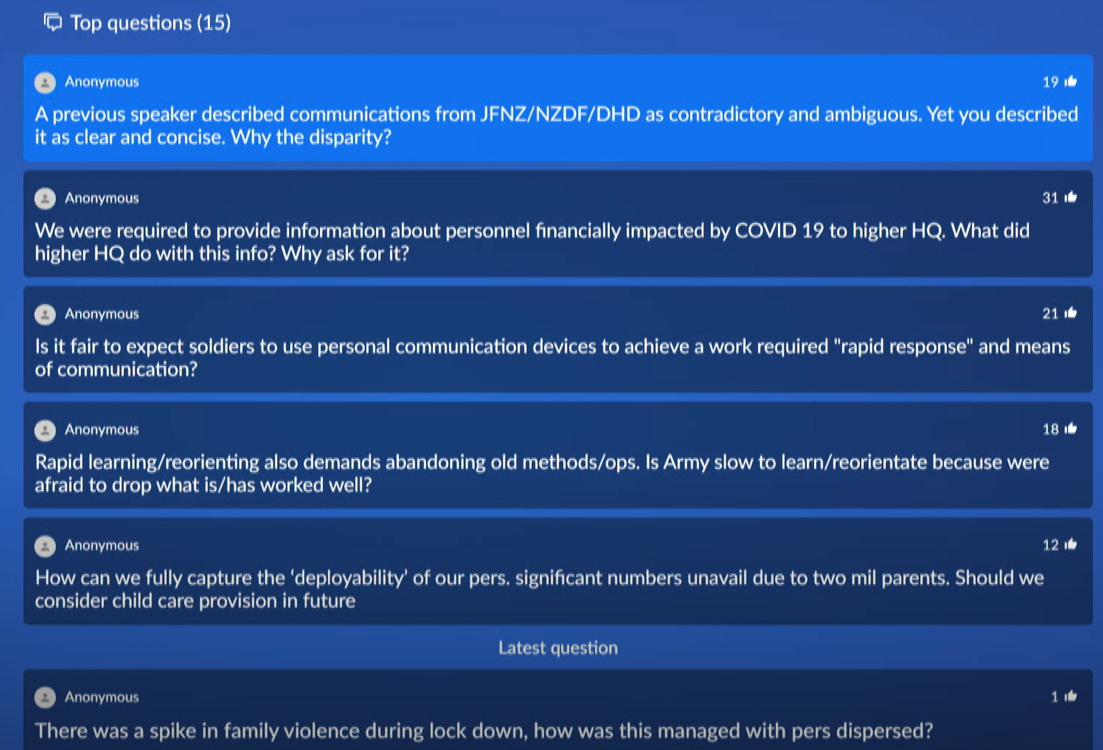 Looking at the lists of participants questions to the panel (all posted anonymously, illustrating a total absence of trust in the room), there were many legitimate concerns. These included having to use personal phones for military comms, increased incidents of domestic violence (already a significant problem in NZ, sadly) and risks of financial data-harvesting.